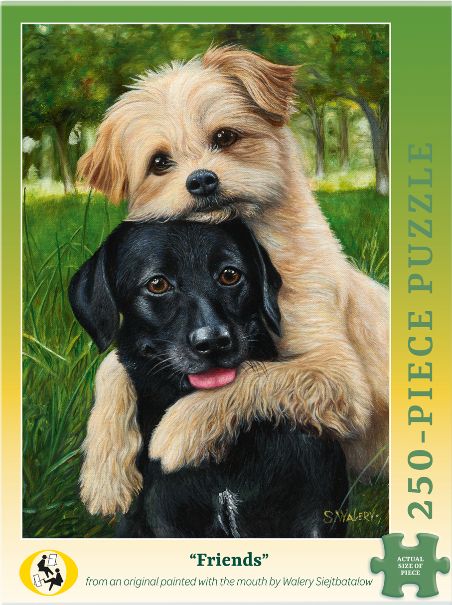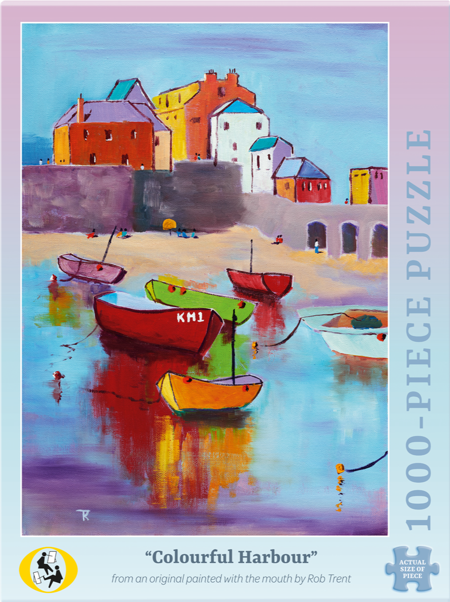 Пазлы: «Курьер в пути», «Город у моря», «Друзья» и «Цветная гавань». Размеры собранного изображения 49 x 69 см.